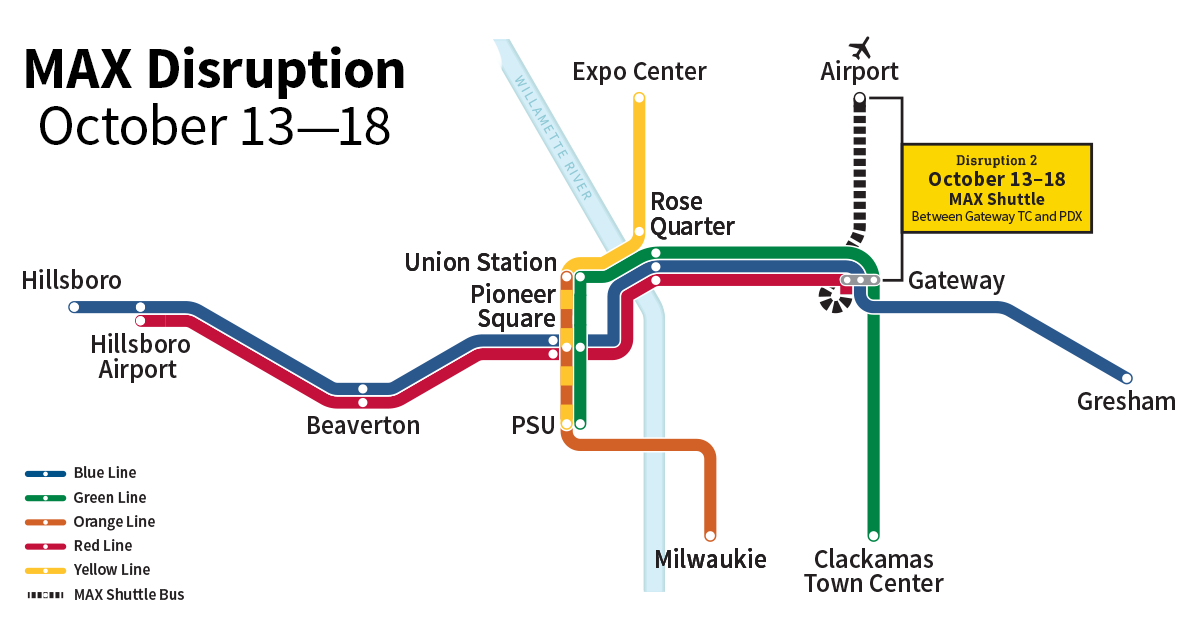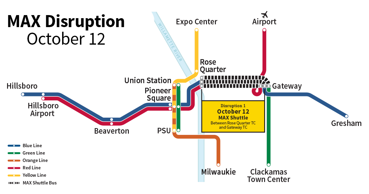 10월 12일 일요일: MAX 블루, 그린, 레드 라인이 중단됩니다. 셔틀 버스는 Rose Quarter Transit Center 와 Gateway/NE 99th Ave Transit Center 사이를 운행합니다.