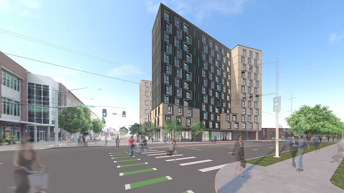 The housing part of the project, called hollywoodHUB, is led by BRIDGE and includes a 12-story building with 222 permanently affordable homes for families and individuals who earn 60% or less of Area Median Income (and two manager units). The building will include indoor and outdoor community spaces and will have resident supportive services and programming provided by Impact NW.